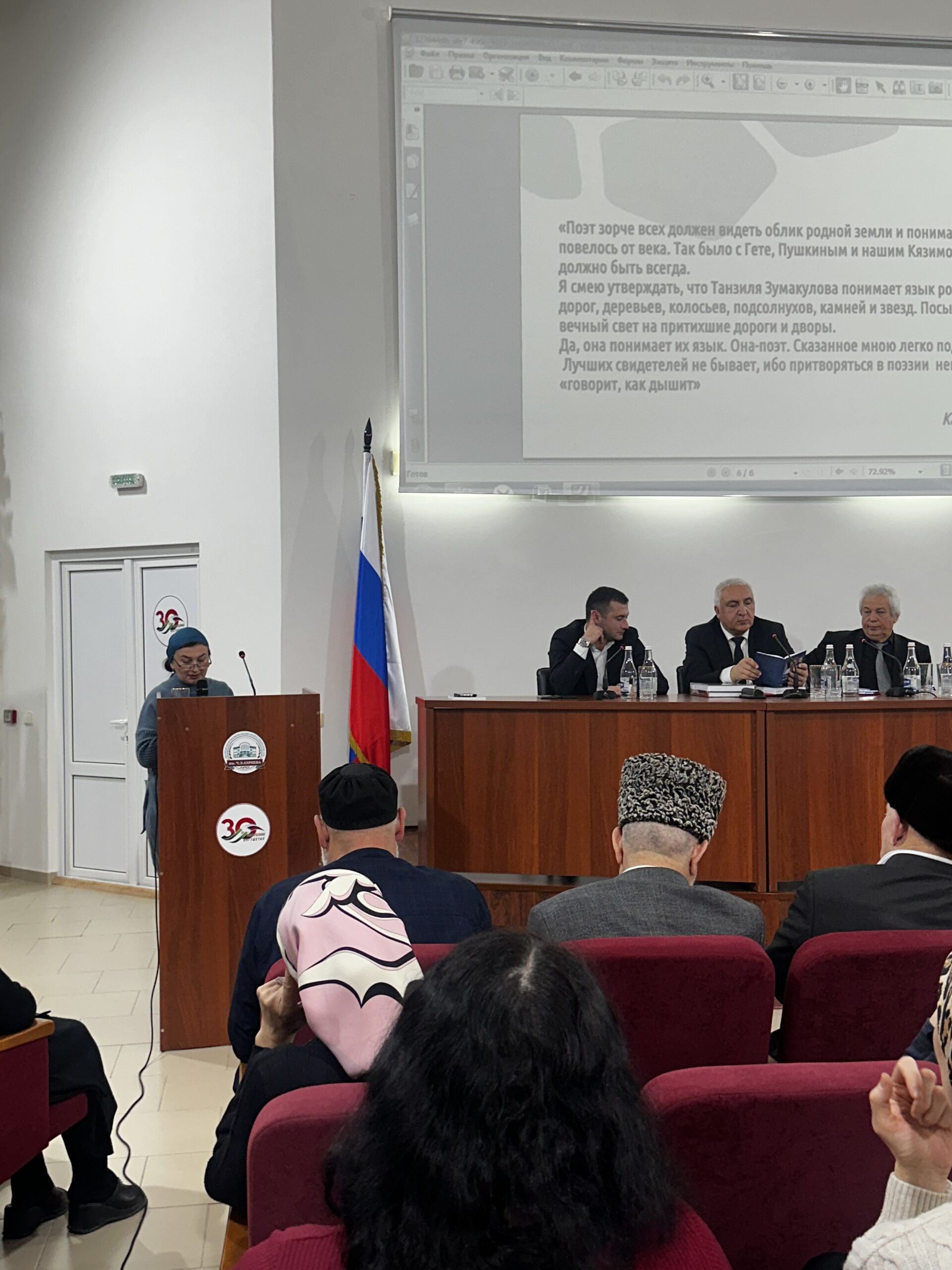 Ведущий научный сотрудник отдела ингушской литературы, кандидат филологических наук Марем Ахметовна Ялхароева в своем аналитическом выступлении рассмотрела поэзию как высшую форму, в которую облекается человеческая мысль, на примере творчества Танзили Зумакуловой. В своем выступлении она детально проанализировала художественное своеобразие лирики поэтессы, обратив внимание на глубинную связь её поэтического слова с народной мудростью, философскую насыщенность и лаконизм стиха.